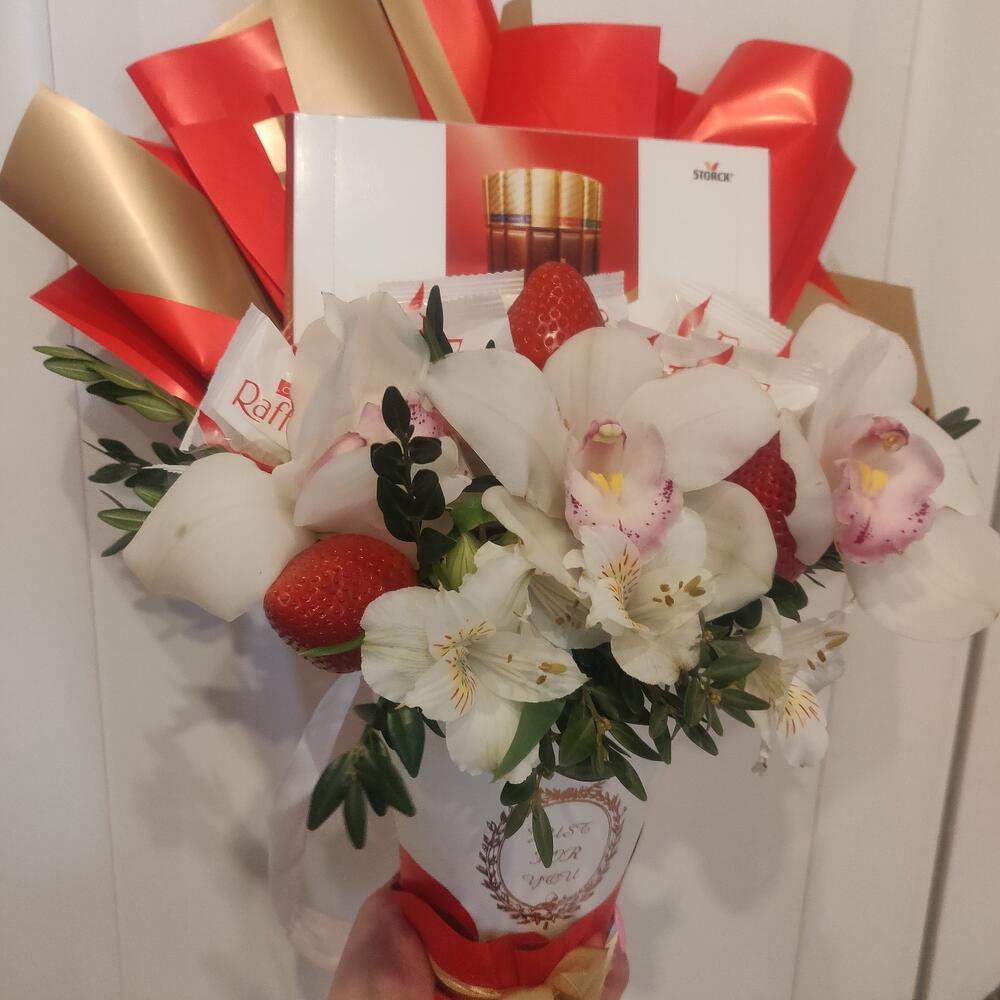 Альстромерия - 3 шт.Клубника - 250 гр.орхидея - 3 шт.Упаковка дизайнерская - 1 шт.Конфеты мерси 250 гр - 1 шт.раффаэлло 150 гр - 1 шт.