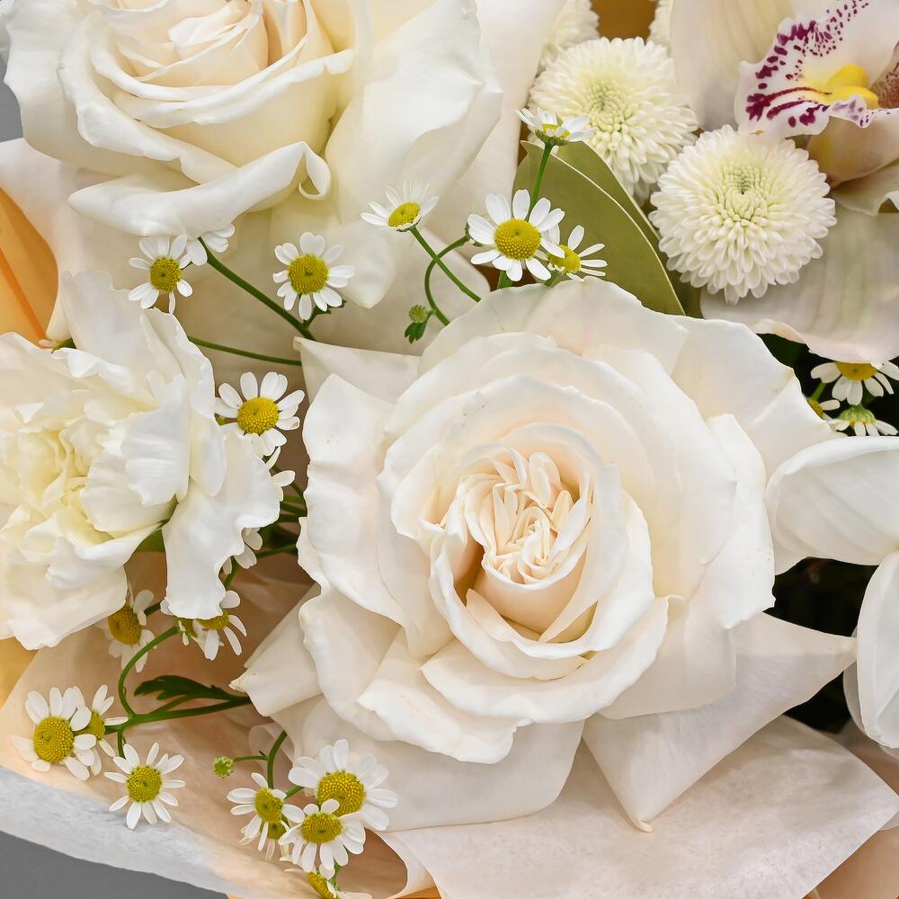 Воздушный букет в бело-желтой цветовой гамме. В составе французские розы, сортовая гвоздика, тюльпан, кустовая ромашка и орхидея ЦимбидиумФлористы студии Цветочный Этикет собрали его из самых свежих цветов, тщательно продумав состав. Букет готов удивлять красотой своего … Показать ещёполучателя! Станет идеальным подарком для любимой женщины, дочке или мамы, на День Рождения, юбилей, свадьбу и другие торжественные мероприятия. С букетом вы получите конверт с открыткой, в которой мы напишем любое пожелание, инструкцию свежести и средство для продления жизни срезанных цветов.